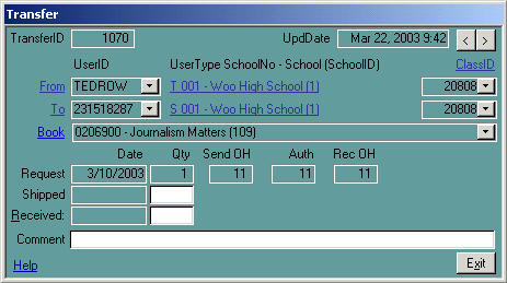 Click the ID, Book, From, To, ReqDate or RcvDate link to sort by that field. Click the TransferID to select